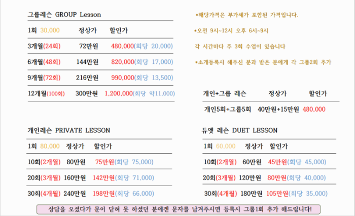 그룹 레슨은 보통 주당 2만원 정도로 36회 가량, 개인 레슨은 10회에 50~70만원 선으로 형성되는 편입니다.